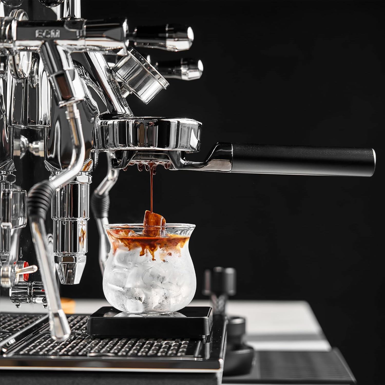 Compared to traditional bottomless portafilters, the IKAPE KKLUO portafilter features a flat design, with a flat, straight back that allows it to be placed directly on the coffee bar countertop. This eliminates the need for a portafilter holder or a coffee tamper mat and tamper station, allowing for direct espresso puck preparation.